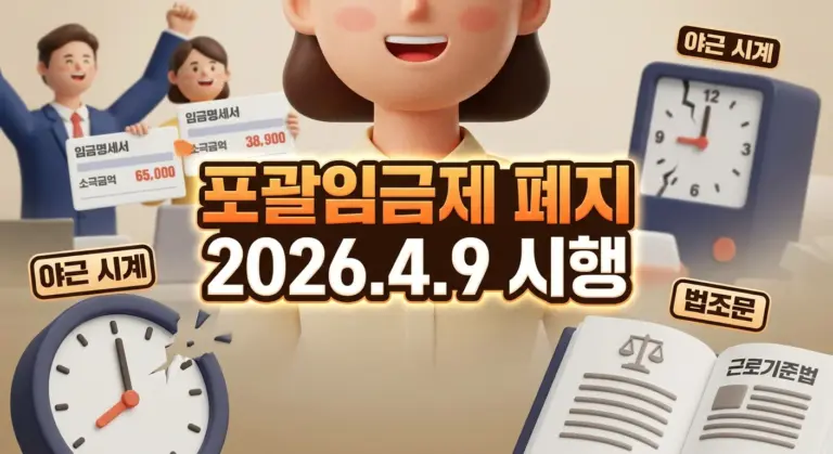 2026년 4월 9일 시행된 고용노동부 지도지침으로 포괄임금제 오남용이 사실상 금지됩니다. 야근·연차수당 차액 청구 가능성, 월급 확인 순서까지 꼭 확인하세요.