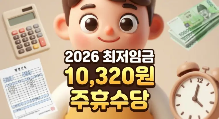 2026년 최저임금 시급 10,320원 확정. 일급·주급·월급·주휴수당까지 한 번에 계산. 주 15시간 넘는 알바라면 꼭 확인하세요.